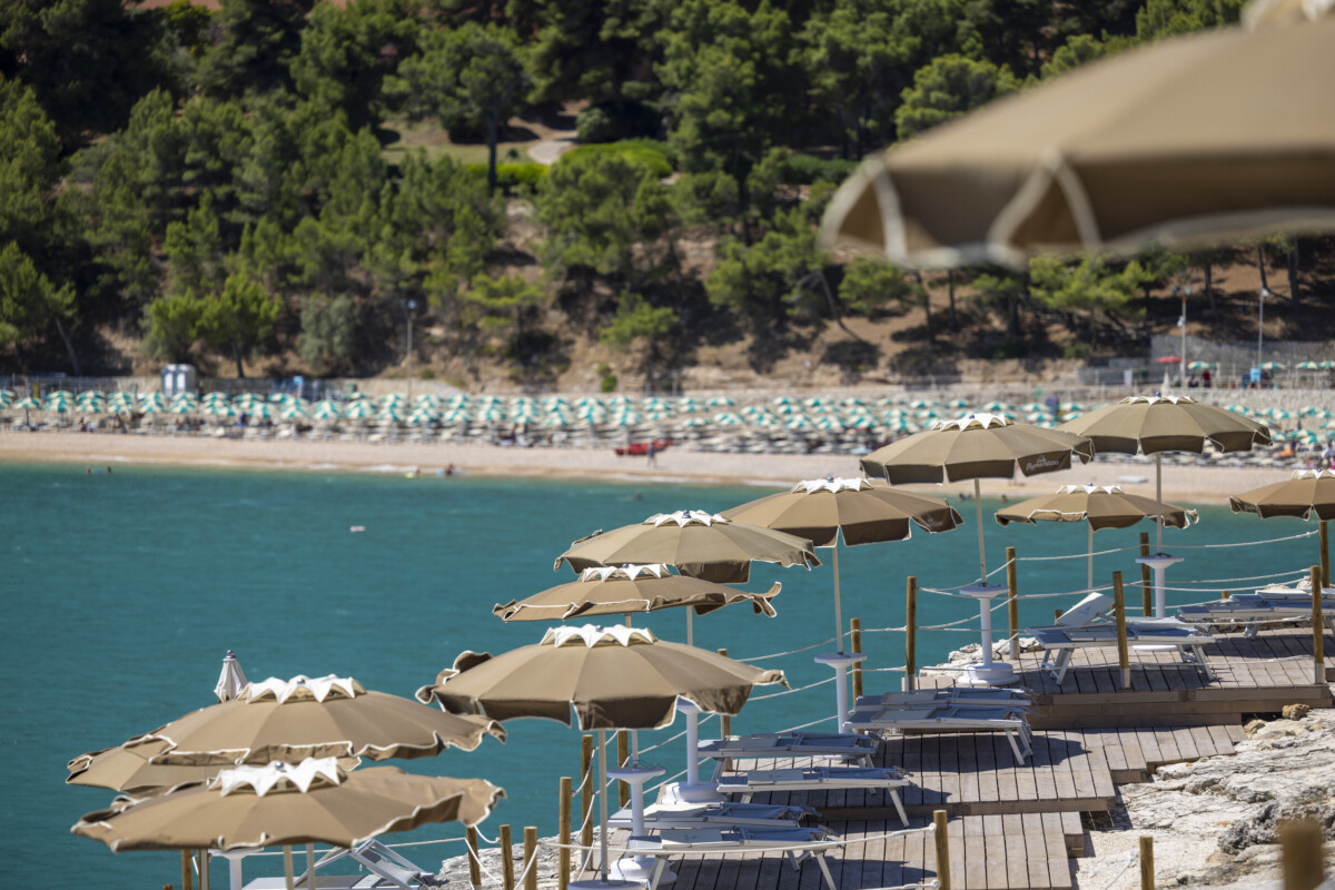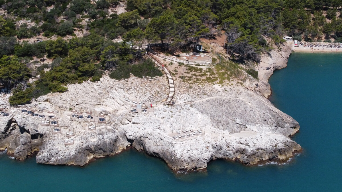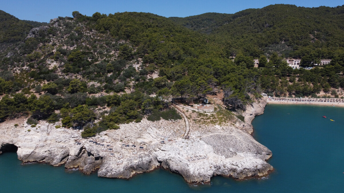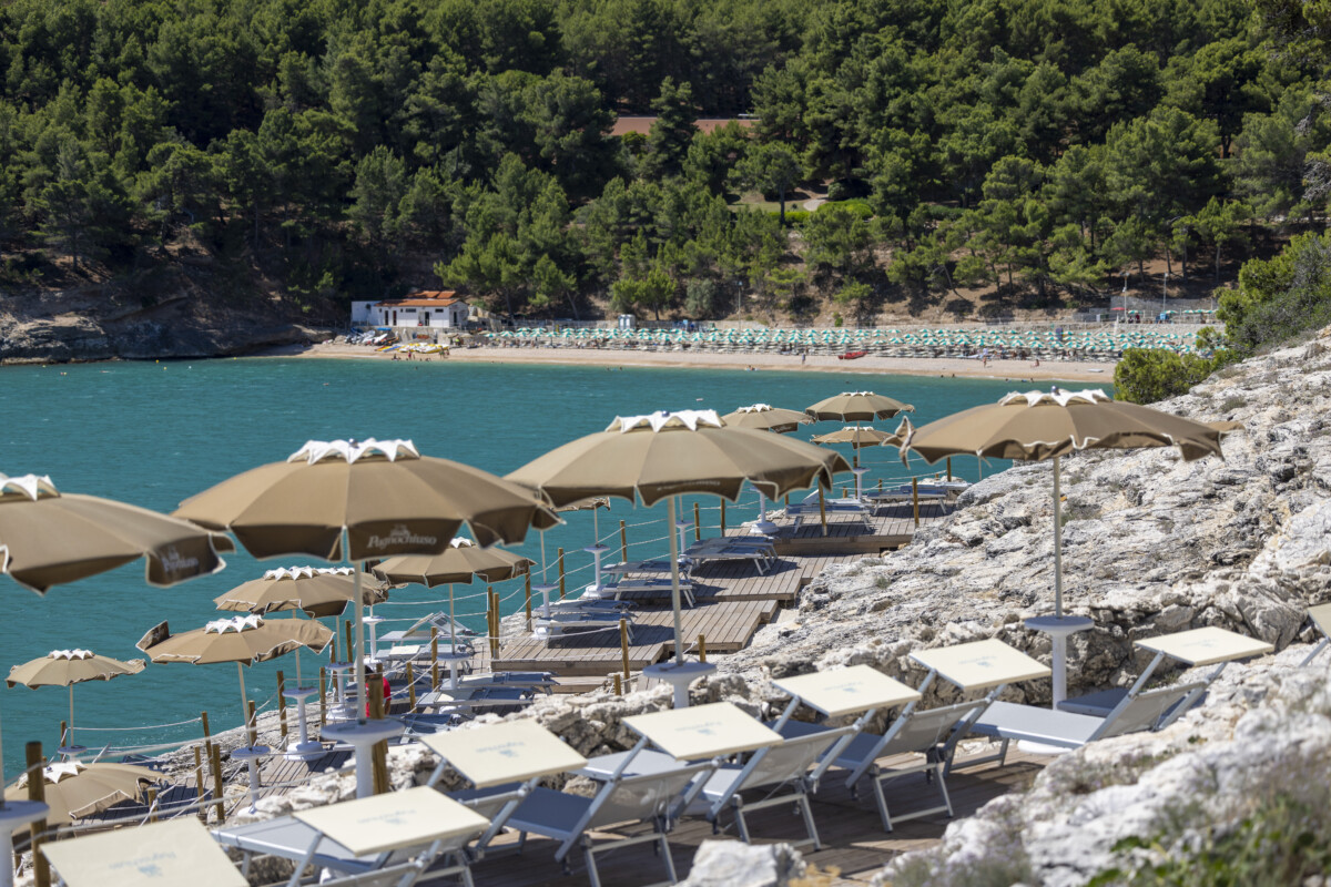 The charming terraces overlooking the sea are panoramic pitches, perfectly integrated into the enchanting cliffs of Pugnochiuso Bay and overlooking the crystalline sea waters. They are equipped with umbrellas and sunbeds, perfect for those who love their privacy and want to fully enjoy crystal clear waters and relaxation in an exclusive way, in contact with nature, ideal for couples or small groups who prefer a more secluded location. They are also convenient for services such as showers and toilets, with the presence of a lifeguard station and a limited drink service. You can dive directly into the blue waters of the bay and then comfortably climb up the ladders on the rocks.