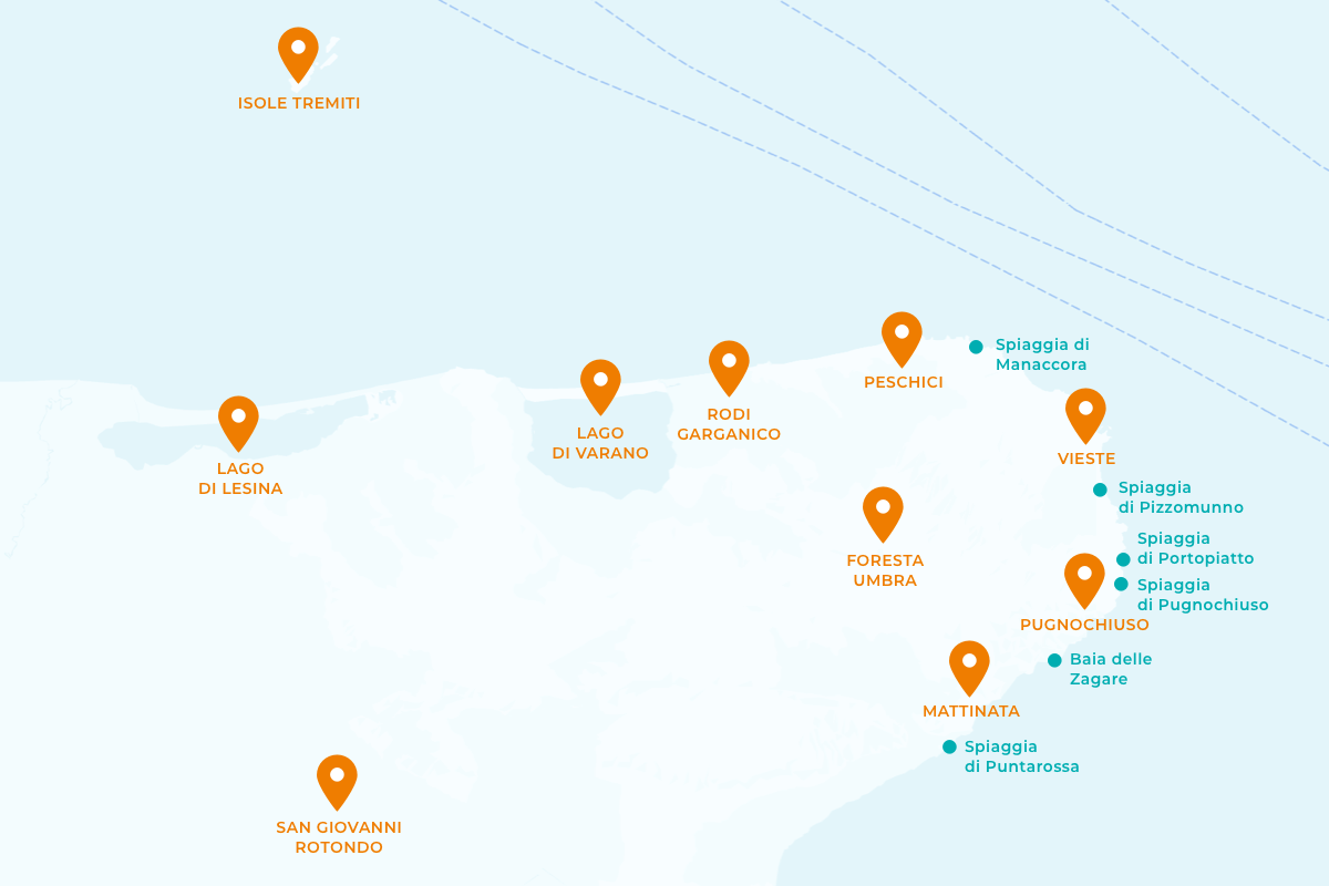 Dalla cartina si nota inoltre che l’intera zona è ricca di vegetazione, infatti, la natura è la protagonista assoluta. Tanto che nel 1991 è stato istituito il Parco Nazionale del Gargano. Il Parco è un vero e proprio regno della biodiversità grazie alla sua fauna e alla sua ricca vegetazione che rappresenta il 40% dell’intera flora italiana.
